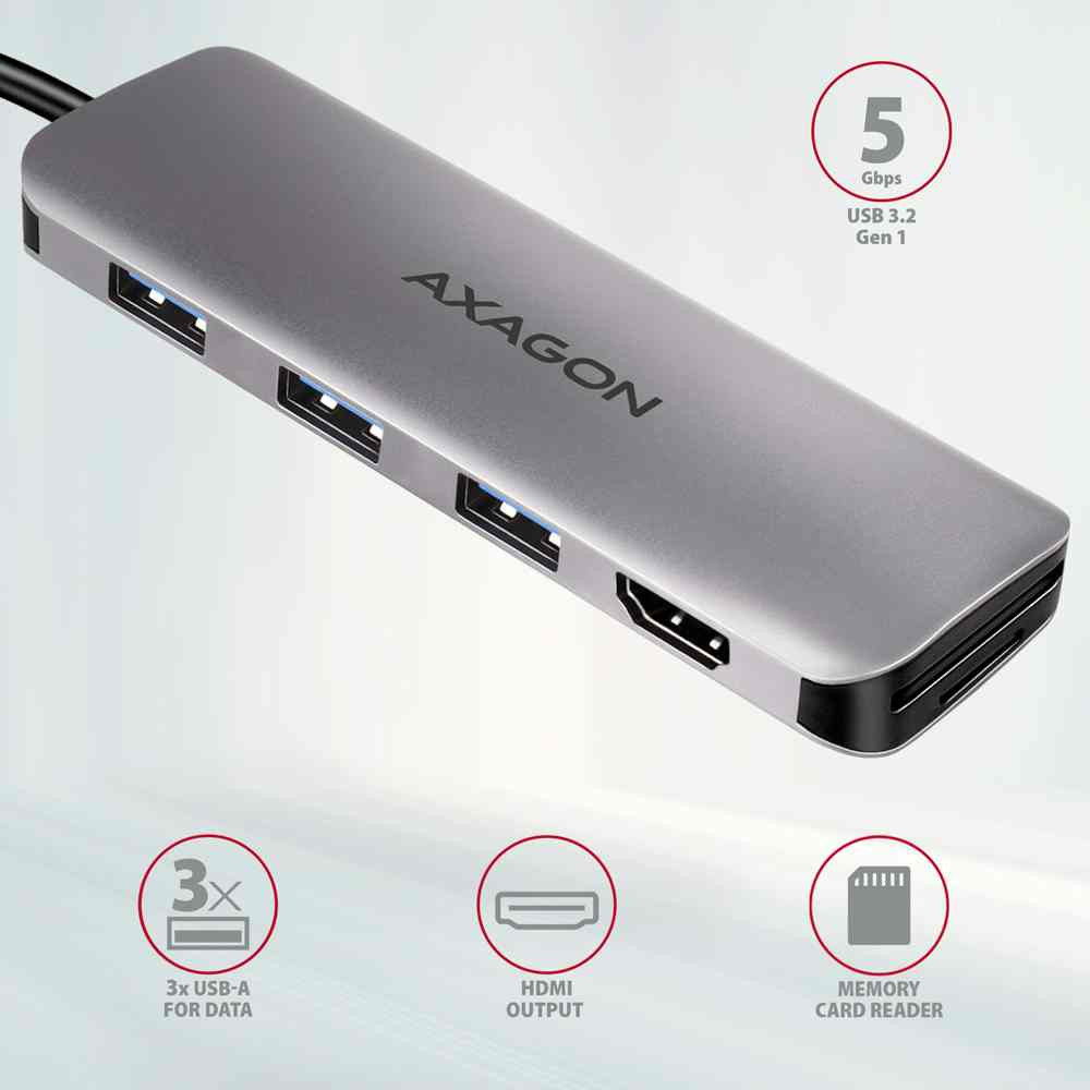 KELLÉK - Dokkoló, USB-C (5 Gbps) apa -> HDMI/3xUSB3.0/SD-microSD olvasó, Axagon