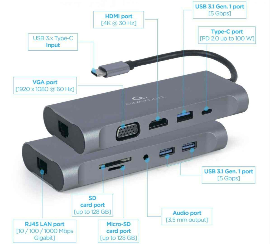 KELLÉK - Dokkoló, USB-C (5 Gbps) apa -> VGA/HDMI/3xUSB3.0/1xUSB-C/LAN, Gembird
