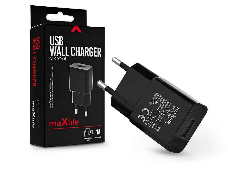 USB - USB töltő, hálózati, 1xUSB, 1A, Maxlife MXTC-01, fekete