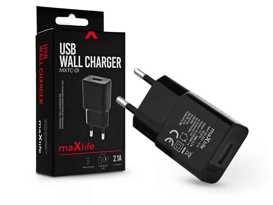 USB - USB töltő, hálózati, 1xUSB, 2.1A, Maxlife MXTC-01, fekete