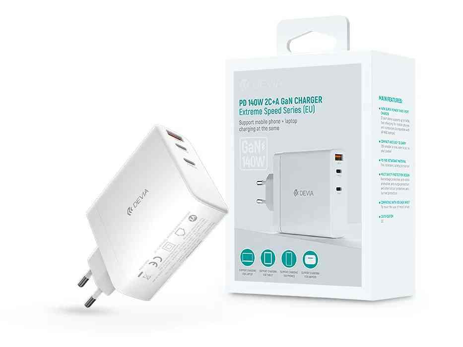 USB - USB töltő, hálózati, 2xUSB-C+1xUSB-A, 150W, Devia GaN, fehér
