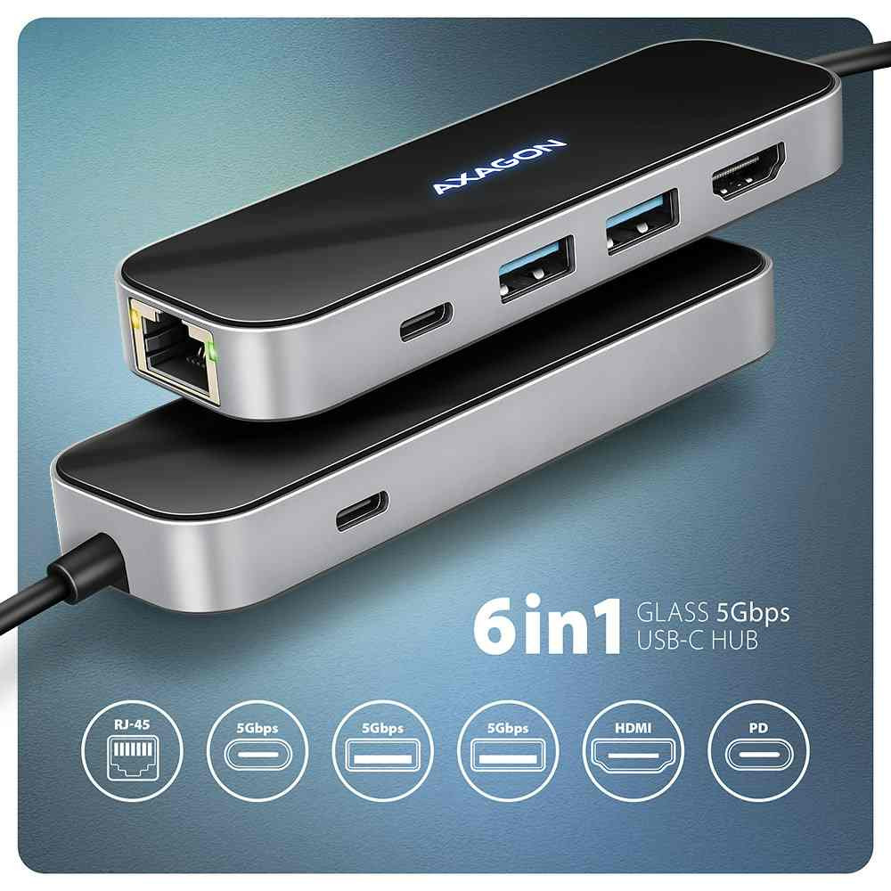 A többportos USB-C 5Gbps AXAGON HMC-6GLN GLASS 6in1 hub hat porttal bővíti laptopját, számítógépét vagy telefonját. Laptopját 20 cm hosszú USB-C kábelen keresztül csatlakoztatja a hubhoz. Azonnal van csatlakoztatása egy monitorhoz, három USB-eszközhöz és egy RJ-45-ös csatlakozóhoz egy Gigabit Ethernet hálózathoz. Lehetőséget kap arra is, hogy a Power Delivery technológiát használó laptopot egyidejűleg táplálja. A portreplikátor így egy univerzális 6 az 1-ben dokkoló állomás funkcióját tölti be a modern laptopokhoz.