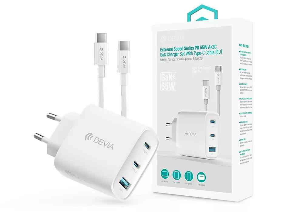 USB - USB töltő, hálózati, 2xUSB-C+1xUSB-A, 65W, Devia GaN, fehér, +2m C-C káb.